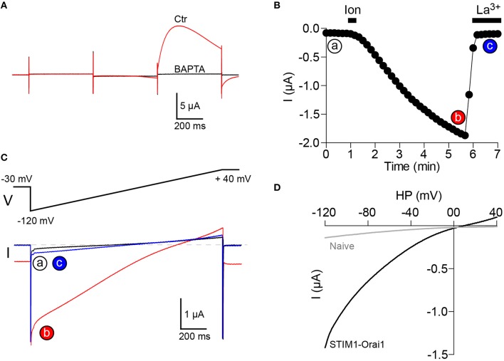 Figure 3. Recording of SOCE current in Xenopus oocytes. (A) Intracellular injection of BAPTA (final concentration 2-5 mM) inhibits CaCC activation. (B) The SOCE current is activated by store depletion using bath applied ionomycin (10 μM, 20 s) and is totally inhibited by La3+ (100 μM). The current is measured at a membrane potential of −120 mV. (C) Current traces obtained using a voltage ramp from −120 mV to +40 mV at time points indicated in (B). (D) Current-voltage relationship of the SOCE current (La3+-sensitive) obtained after subtraction of the La3+ resistant fraction (c) from the global current (b). The current is dramatically increased in oocytes overexpressing STIM1 and Orai1. Recordings in (A–C) are made on a cell overexpressing STIM1 and Orai1.