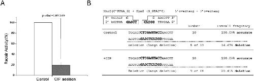 Figure 5. End dephosphorylation reduced the repair efficiency without promoting end resection.(A) The 3′-overhang/5′-overhang template was incubated with calf intestinal alkaline phosphatase (CIP), or control buffer, prior to the addition in Xenopus egg extracts. The repair activity (in relative to the control extract) was measured by colony numbers. A minimum of three experiments were carried out and the results are shown as the mean values and standard deviations. Statistical significance was analyzed using an unpaired 2-tailed Student’s t-test. A p-value0.05 was considered statistically significant. (B) The repair assay with CIP incubation was established as in panel A. Ten final repair products were sequenced and shown. Repair products with large-fragment deletion were determined by agarose gel electrophoresis.