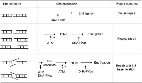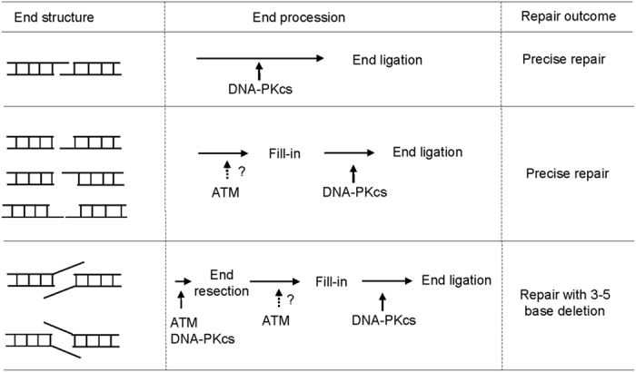 Figure 6. The pattern of NHEJ end processing is specific to the end structure and dependent on ATM and DNA-PKcs.Compatible ends, and non-compatible ends with blunt/3′-overhang, blunt/5′-overhang, and 3′-overhang/5′-overhang were predominantly repaired with fill-in and ligation without resection of end nucleotides. In contrast, 3′-overhang/3′-overhang or 5′-overhang/5′-overhang templates were processed by resection of 3–5 bases and 1–4 base fill-in prior to end ligation. Therefore, the NHEJ machinery exhibited a strong preference for precise repair; the presence of neither non-compatible ends nor protruding single strand DNA sufficiently warranted the action of nucleases. Direct ligation of compatible ends is dependent on the kinase activity of DNA-PKcs but not ATM. ATM was required for the efficient repair of all non-compatible ends, suggesting that ATM-dependent phosphorylation may regulate both end resection and fill-in.