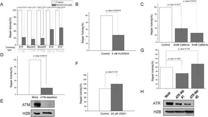 Figure 3. ATM is required for the repair of non-compatible DSB ends.(A) Xenopus egg extracts were supplemented with or without ATM inhibitor KU60019, and incubated with various types of NHEJ templates as in Fig. S2. The repair activity (in relative to the control extract) was measured by colony numbers. (B) Xenopus egg extracts were supplemented with or without ATM inhibitor KU55933, and incubated with the 5′/3′ NHEJ template. The repair activity (in relative to the control extract) was measured by colony numbers. (C) Xenopus egg extracts were supplemented with or without caffeine to inhibit ATM/ATR, and incubated with the 5′/3′ NHEJ template. The repair activity (in relative to the control extract) was measured by colony numbers. (D,E) ATM was depleted fromXenopus egg extract as described in Materials and Methods. The extract was incubated with the 5′/3′ NHEJ template, and the repair activity (in relative to the control extract) was measured by colony numbers. The efficiency of ATM depletion was confirmed by immunoblotting. (F) Xenopus egg extracts were supplemented with or without ATR inhibitor VE821, and incubated with the 5′/3′ template. The repair activity (in relative to the control extract) was measured by colony numbers. (H,G) ATR was depleted fromXenopus egg extract. The extract was incubated with the 5′/3′ NHEJ template, and the repair activity (in relative to the control extract) was measured by colony numbers. The efficiency of ATR depletion was confirmed by immunoblotting. In panels A, B, C, D, F & G, a minimum of three experiments were carried out and the results are shown as the mean values and standard deviations. Statistical significance was analyzed using an unpaired 2-tailed Student’s t-test. A p-value < 0.05 was considered statistically significant.
