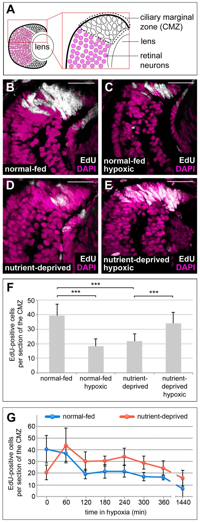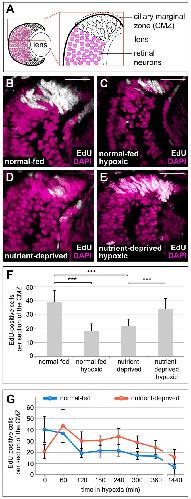 Figure 1. Hypoxia affects proliferation of progenitors in the retinal stem cell niche in the opposite manner, dependent on the nutritional status. (A) Schematic representation of a cross section through a 38-stage Xenopus retina, indicating the position of the ciliary marginal zone (CMZ). (BâE) EdU incorporation measured after a 2 h EdU pulse in DAPI-stained retinas from animals that have been normal-fed (B,C) or nutrient-deprived for 24 h (D,E) incubated under normoxia (B,D) or hypoxia (C,E). Nutrient deprivation or hypoxia reduced the number of proliferating cells in the CMZ, whereas hypoxic nutrient-deprived retinas show an increase of proliferation in the CMZ. Scale bars = 50 µm. For each condition, between 10 and 15 retinas were quantified. (F) Quantification of the experiment performed in (BâE). Error bars represent standard deviations. Two hooked ends of horizontal lines indicate the two conditions compared, *** p-value < 0.001; n = 7. (G) Quantification of EdU-positive cells after an 1 h EdU incorporation in retinas from normal-fed (blue line) or nutrient-deprived (red line) animals after various times in hypoxia (time in minutes indicated on the x-axis). Error bars represent standard deviations of two independent experiments (n = 2). For each condition and time point, a minimum of 10 retinas was quantified. |
