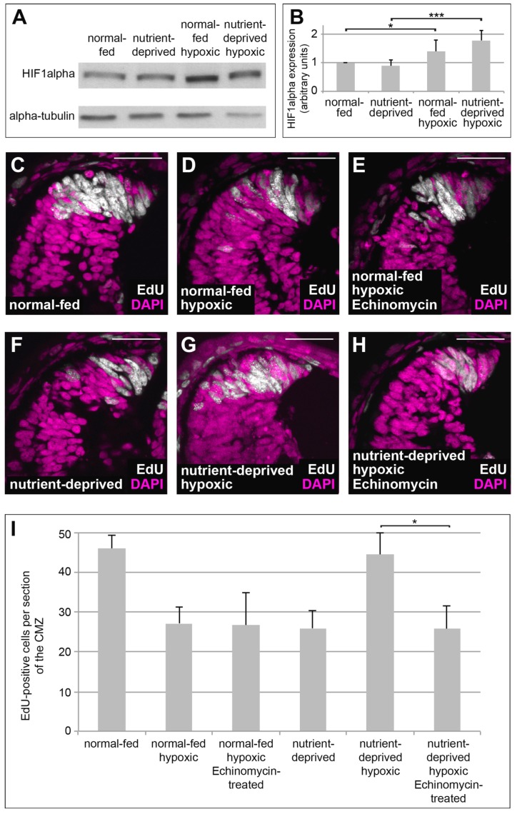Figure 2. HIF-1 activity is required to induce re-initiation of proliferation in nutrient-deprived hypoxic retinas. (A) Western blot of retinas isolated from normal-fed or nutrient-deprived animals kept under normal oxygen concentrations or in hypoxia, probed for HIF-1α subunit and α-tubulin. HIF-1α is stabilized under hypoxia in both normal-fed and nutrient-deprived animals. At least 22 retinas were taken for each condition; all conditions in each experiment have the same number of retinas (n = 5). (B) Quantification of the Western blot performed in (A). Error bars represent standard deviations. Two hooked ends of horizontal lines indicate the two conditions compared, * p-value < 0.05, *** p-value < 0.001; n = 5. (C–H) EdU incorporation in DAPI-stained retinas from normal-fed animals (C–E) kept in normoxia (C), hypoxia (D) or incubated with Echinomycin under hypoxia (E) and in nutrient-deprived animals kept in normoxia (F), hypoxia (G) or incubated with Echinomycin under hypoxia (H). Nutrient-deprived retinas no longer resume their proliferation in hypoxia when function of HIF-1 is blocked by Echinomycin. Scale bars = 50 µm. In each condition, a minimum of 10 retinas was examined. (I) Quantification of the experiment performed in (C–H). Error bars represent standard deviations between three independent experiments. Two hooked ends of horizontal lines indicate the two conditions compared, * p-value < 0.05; n > 3. For each condition, between 10 and 15 retinas were quantified. |