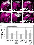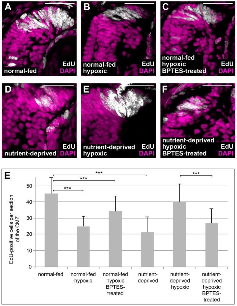 Figure 4. Block in glutaminolysis interferes with re-initiation of proliferation in nutrient-deprived hypoxic retinas. (A–F) EdU incorporation in DAPI-stained retinas from normal-fed animals (A–C) kept in normoxia (A), hypoxia (B) or incubated with BPTES under hypoxia (C) and in nutrient-deprived animals kept in normoxia (D), hypoxia (E) or incubated with BPTES under hypoxia (F). Nutrient-deprived retinas no longer resume their proliferation in hypoxia when glutaminolysis is blocked by BPTES. Scale bars = 50 µm. In each condition, a minimum of 8 retinas was observed. (E) Quantification of the experiment performed in (A–F). Error bars represent standard deviations between three independent experiments. Two hooked ends of horizontal lines indicate the two conditions compared, *** p-value < 0.001, n = 3. For each condition, between 8 and 17 retinas were quantified. |