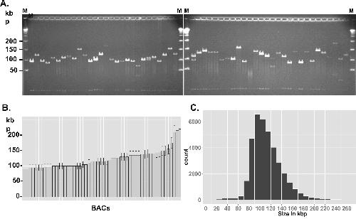 Fig. 1. Evaluation of XTHR BAC insert sizes. (A) Picture of a pulsed-field gel electrophoresis gel on 56 randomly selected BAC clones. Each BAC DNA was digested using NotI before PFGE. M: bacteriophage Lambda DNA concatemers used as molecular weight markers (Bio-Rad). Note the released vector fragment band at the bottom of the gel. (B) Bar-plot representation of 55 BAC insert sizes, sorted by size. Each bar represents the BAC insert size as determined from the gels shown in panel A. The error bar represents 10% of measurement uncertainty. Each bar corresponds to a BAC clone. (C) Frequency distribution of insert sizes determined by the mapping of XTHR BAC end sequences on X. tropicalis genome sequence version 9.