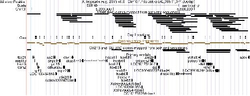 Fig. 5. Sequence comparison between one XTHR BAC and the X. tropicalis reference genome. The BAC ALN0AAA10M06 containing a portion of the cnpy3 gene was aligned against the reference genome assembly version 7.1. The BAC sequence is represented on the top and the reference genome on the bottom. The plot displays the percentage of identity, gaps in the assembly are visible as area with less than 70% of similarity. The red band corresponds to sequence segments aligned with more than 70% similarity. (For interpretation of the references to color in this figure legend, the reader is referred to the web version of this article.)