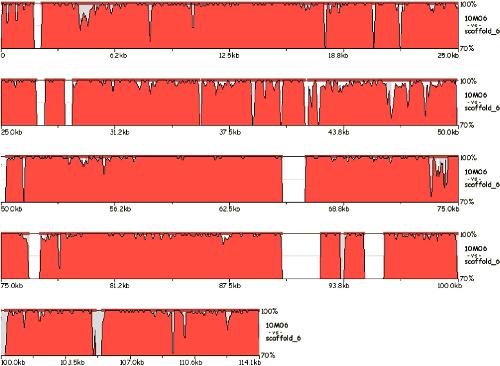 Fig. 5. Sequence comparison between one XTHR BAC and the X. tropicalis reference genome. The BAC ALN0AAA10M06 containing a portion of the cnpy3 gene was aligned against the reference genome assembly version 7.1. The BAC sequence is represented on the top and the reference genome on the bottom. The plot displays the percentage of identity, gaps in the assembly are visible as area with less than 70% of similarity. The red band corresponds to sequence segments aligned with more than 70% similarity. (For interpretation of the references to color in this figure legend, the reader is referred to the web version of this article.)