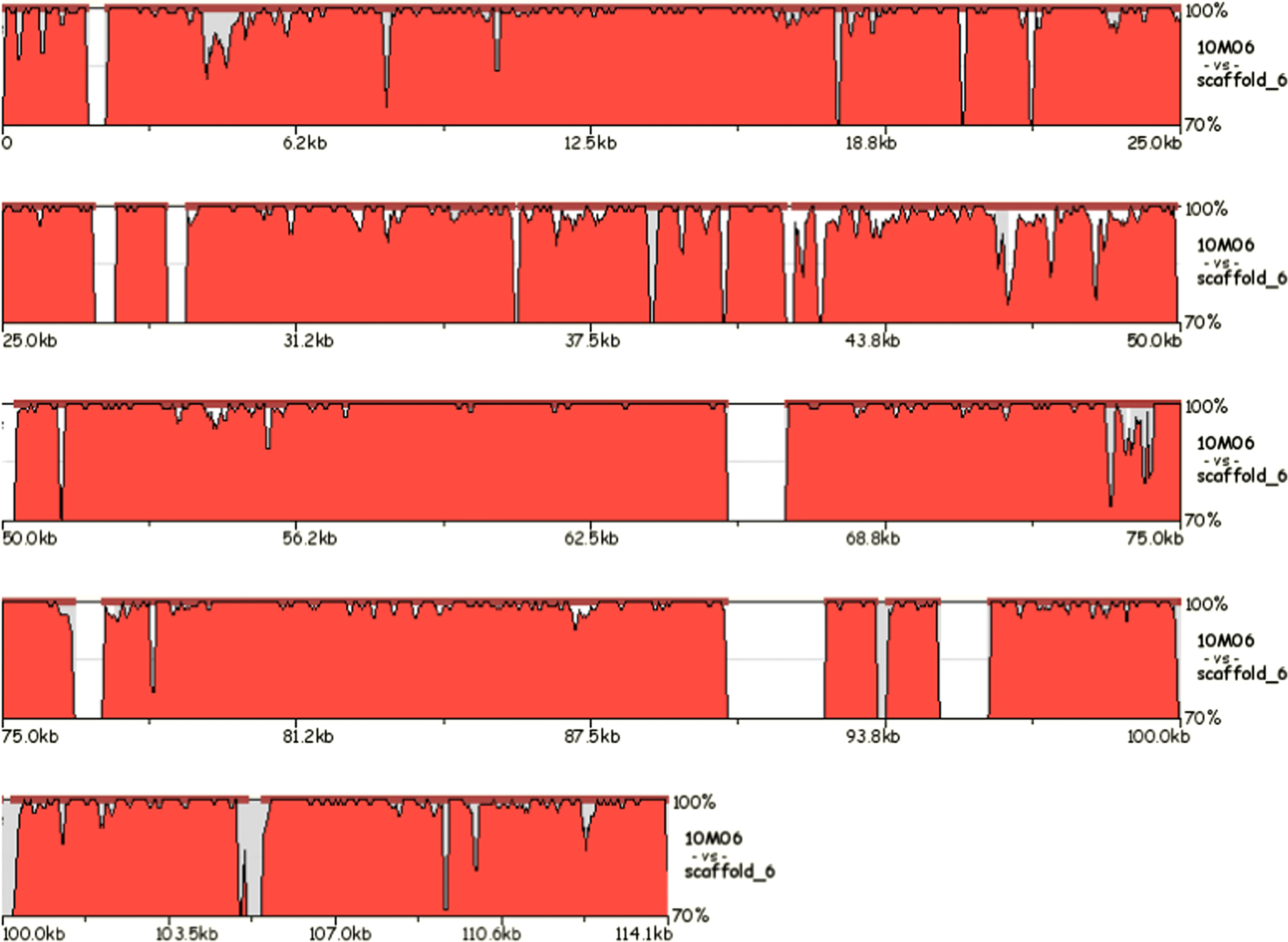 Fig. 5. Sequence comparison between one XTHR BAC and the X. tropicalis reference genome. The BAC ALN0AAA10M06 containing a portion of the cnpy3 gene was aligned against the reference genome assembly version 7.1. The BAC sequence is represented on the top and the reference genome on the bottom. The plot displays the percentage of identity, gaps in the assembly are visible as area with less than 70% of similarity. The red band corresponds to sequence segments aligned with more than 70% similarity. (For interpretation of the references to color in this figure legend, the reader is referred to the web version of this article.)