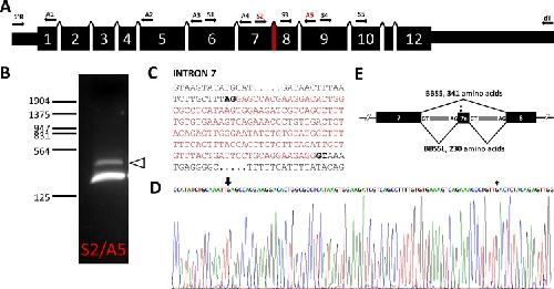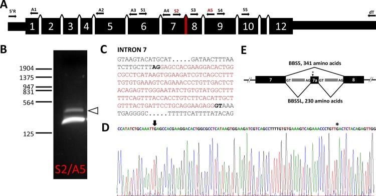 Fig 2. The mouse Bbs5 gene and alternative transcripts.(A) Structure of the murine Bbs5 gene; locations for sense (S) and anti-sense (A) primers used to test for alternative transcripts are indicated above the gene structure, along with oligo(dT) and 5’RACE primers (5’R). (B) PCR amplification of reverse-transcribed murine retinal poly(A)+ RNA with S2 and A5 primers separated by agarose electrophoresis; arrowhead indicates a DNA product larger than the expected 216 bp product. (C) DNA sequence of intron 7 of Bbs5 with the alternatively spliced region indicated in red (potential splice donor/acceptor sites are bold faced). (D) Sequence chromatogram of the alternative Bbs5 transcript (BBS5L) with the beginning of the cryptic exon 7a (arrow) and stop codon (asterisk) indicated. (E) Gene structure of exons 7, 7a, and 8 showing the two splicing patterns detected for the Bbs5 transcript (the location of the stop codon in Exon 7a is indicated with an asterisk).