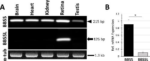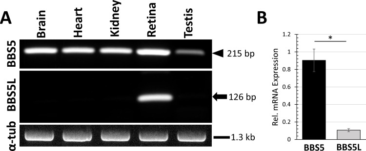 Fig 3. Reverse transcription-PCR amplification of Bbs5 and Bbs5L from various murine tissues.(A) cDNA prepared from poly(A)+ RNA isolated from the five indicated tissues was amplified with primers specific for Bbs5 (upper panel; arrowhead indicates expected 215 bp product), Bbs5L (middle panel; arrow indicates expected 126 bp product), or alpha-tubulin for quality control (lower panel). (B) Quantitative RT-PCR was performed for Bbs5 and Bbs5L using cDNA prepared from retinal poly(A)+ RNA and quantified relative to levels of β-actin cDNA (n = 3; error bars indicate SEM; ρ<0.05).