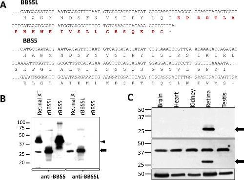 METHODS: Reverse transcription PCR from RNA was used to isolate and identify potential alternative transcripts of Bbs5. A peptide unique to the C-terminus of the BBS5 splice variant was synthesized and used to prepare antibodies that selectively recognized the BBS5 splice variant. These antibodies were used on immunoblots of tissue extracts to determine the extent of expression of the alternative transcript and on tissue slices to determine the localization of expressed protein. Pull-down of fluorescently labeled arrestin1 by immunoprecipitation of the BBS5 splice variant was performed to assess functional interaction between the two proteins.