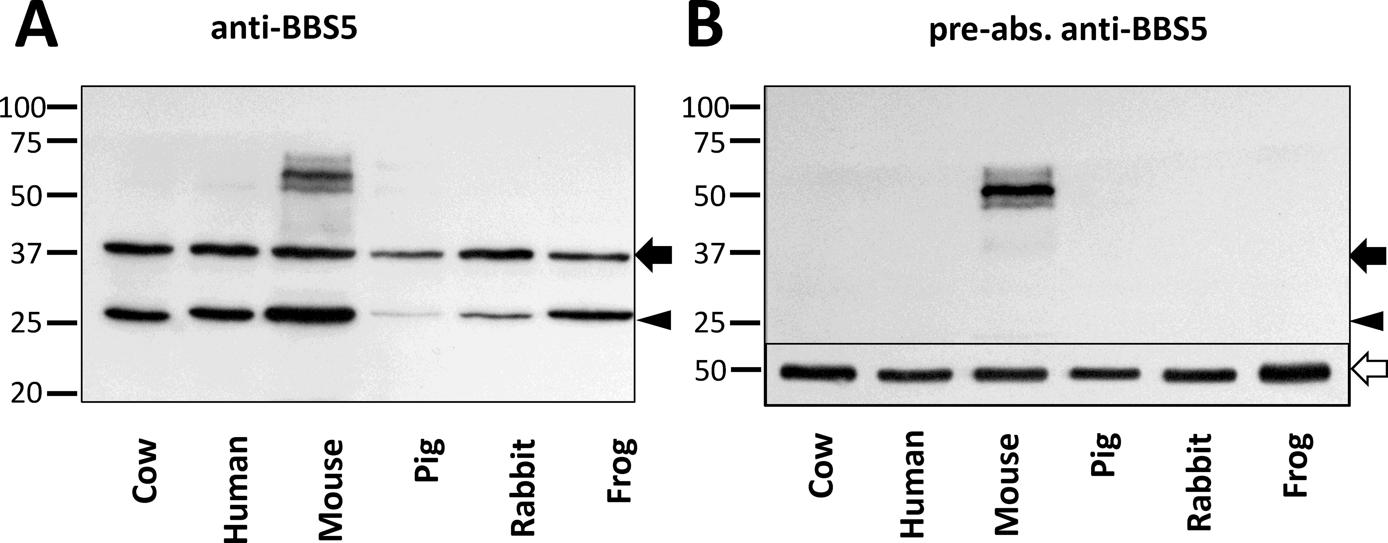 Fig 1. A smaller molecular mass form of BBS5 is detected in retinal extracts from a variety of vertebrates. (A) Immunoblots of extracts of aqueous soluble proteins prepared from whole retinas from the indicated species probed with anti-BBS5 #7â15 monoclonal antibody described in [19]. Arrow indicates the expected molecular size of BBS5; arrowhead indicates a smaller immunoreactive band at 26 kD. (B) A replicate blot was probed with the same antibody that was pre-incubated with heterologously-expressed recombinant murine BBS5. Inset, at the bottom of the blot shows a replicate blot stained for beta-tubulin as a loading control (beta-tubulin indicated with an open arrow).