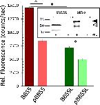 Fig 7. Binding of arrestin1 by BBS5L relative to BBS5, comparing unphosphorylated and phosphorylated conditions.ARR1-Alexa546 was co-immunoprecipitated with BBS5/GST or BBS5L/GST fusion protein with anti-GST antibody and precipitated arrestin1 measured fluorimetrically. ARR1-Alexa546 was pulled down by both BBS5L and BBS5, although the precipitation by BBS5L/GST was significantly less than by BBS5 (n = 6; ρ<0.05). Phosphorylation significantly reduced the pulldown of arrestin1 by both BBS5 and BBS5L (n = 6; ρ<0.05); error bars indicate SEM. Inset shows an immunoblot of the BBS5 and BBS5L proteins probed with anti-phosphoserine antibody after phosphorylation with (+) or without (-) PKC; arrowheads indicate the expected molecular mass for BBS5L-GST (open arrowhead) and BBS5-GST (black arrowhead).