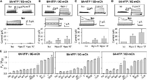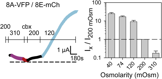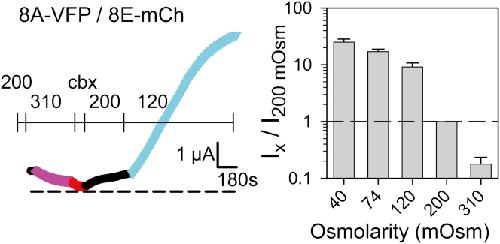Figure 8. Osmolarity dependence of 8A-VFP/8E-mCherry. Left: currents at 60 mV are plotted vs. time. Colors correspond to the different extracellular osmolarities applied (200, 310, 120 mOsm); additionally, CBX was applied to test the endogenous current contribution. Right: quantification of the osmolarity dependence of 8A-VFP/8E-mCherry. Currents at 60 mV recorded at osmolarity values between 40 and 310 mOsm are normalized to the currents measured in âIsoâ solution (200 mOsm). Error bars indicate SD (n ⤠5). To see this figure in color, go online. |