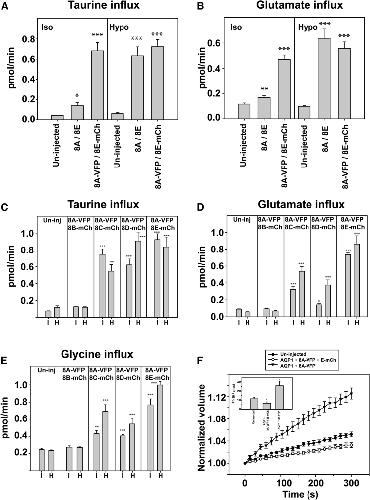 Figure 4. Uptake of osmolytes through LRRC8 proteins in Xenopus oocytes. (A and B) Comparison of the mean values of taurine (A) and glutamate (B) uptake between uninjected (n ⥠6) oocytes, oocytes injected with nontagged 8A/8E (n ⥠5) and oocytes injected with fluorescent-tagged 8A-VFP/8E-mCherry (n ⥠6) in âIsoâ solution (left) and âHypoâ solution (right). (CâE) Comparison of the mean values of taurine (C), glutamate (D), and glycine (E) uptake between uninjected oocytes and oocytes injected with 8A-VFP co-expressed with 8B-mCherry, 8C-mCherry, 8D-mCherry, and 8E-mCherry (n ⥠3 for all co-expressions) in Iso âIâ and Hypo âHâ solution. (F) Time course of normalized oocyte volume in ND48 solution and apparent water permeability mean values (inset) of uninjected oocytes (n = 6), AQP1 + 8A-VFP (n = 8), and AQP1 + 8A-VFP/8E-mCherry (n = 10) injected oocytes. Data indicate the mean ± SE. âp < 0.05, ââp < 0.01, âââp < 0.001. |