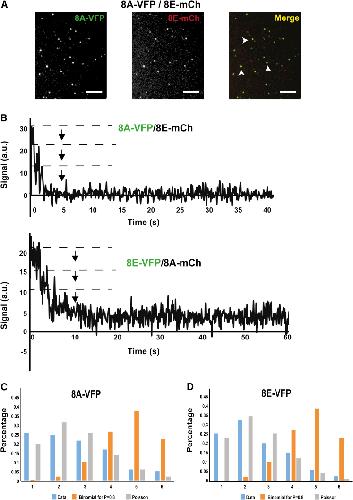 Figure 7. Subunit counting of LRRC8 heteromers by single-step photobleaching. (A) TIRF image showing LRRC8A-VFP and LRRC8E-mCherry oligomers on the Xenopus oocyte membrane and a merge of the two fluorescent channels. Arrowheads point to overlapping LRRC8A and LRRC8E spots. Scale bar: 5 μm. (B) Intensity-time traces showing individual photobleaching steps from one of the LRRC8A-VFP oligomers in complex with LRRC8E-mCherry (upper) or the LRRC8E-VFP oligomers in complex with LRRC8A-mCherry (lower) identified on the oocyte membrane in TIRF microscopy. Dashed lines and arrows indicate observed single steps. (C) Distribution of the percentage of counted steps (n = 142) from LRRC8A-VFP oligomers in complex with LRRC8E-mCherry oligomers at equimolar ratio. (D) Distribution of the percentage of counted steps (n = 158) from LRRC8E-VFP oligomers in complex with LRRC8A-mCherry oligomers at equimolar ratio. Blue bars in C and D indicate the data, orange bars show the prediction of a binomial distribution (Eq. 4) with P = 0.8 and gray bars indicate the best fits of Poisson distribution (Eq. 5). To see this figure in color, go online. |