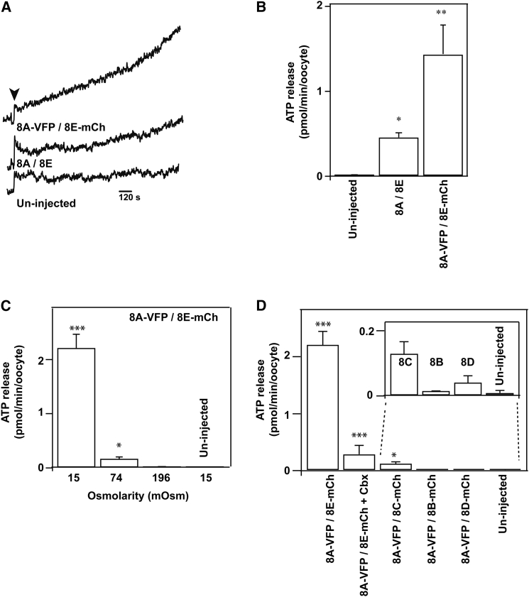 Figure 5. ATP release through LRRC8 proteins. (A) ATP-release representative traces of uninjected oocytes (bottom), oocytes injected with 8A/8E (middle), and oocytes injected with 8A-VFP/8E-mCherry (top). The black arrowhead indicates the beginning of the hypotonic exposure (15 mOsm). (B) Amount of ATP released (pmol/oocyte/min) from uninjected oocytes (n = 4), oocytes injected with 8A/8E (n = 5) and oocytes injected with 8A-VFP/8E-mCherry (n = 5). (C) Amount of ATP released from oocytes injected with 8A-VFP/8E-mCherry incubated in solutions with different osmolarities, 15 (n = 6), 74 (n = 4), and 196 (n = 4) mOsm, or from uninjected oocytes at 15 mOsm (n = 4). (D) Amount of ATP released in hypotonic conditions from oocytes injected with 8A-VFP/8E-mCherry (n = 6), 8A-VFP/8E-mCherry in the presence of 100 μM CBX (n = 5), 8A-VFP/8C-mCherry (n = 4), 8A-VFP/8B-mCherry (n = 4), 8A-VFP/8D-mCherry (n = 4), and uninjected oocytes (n = 4). Data indicate the mean ± SE. âp < 0.05, ââp < 0.01, âââp < 0.001. |