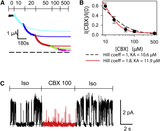 Figure 6. Carbenoxolone inhibition of 8A-VFP/8E-mCherry. (A) Currents recorded in voltage clamp at 60 mV are plotted as function of the time. Colors correspond to the different CBX concentrations (10, 20, 50, 100, 500 μM) applied during the experiment. In order to estimate the steady-state effect, single-exponential functions were fitted to the time course and extrapolated to infinite time (solid colored lines). (B) Concentration dependence of CBX modulation of hLRRC8A-VFP/8E-mCherry. Currents acquired at 60 mV are normalized to values measured in “Iso” solution and plotted versus CBX concentrations. The red line represents the best fit of hLRRC8A-VFP/8E-mCherry currents (fit parameters: Hill coefficient = 1.8, KA = 11.9 μM, p∞ = 0.038), while the black dashed line (fit parameters: Hill coefficient = 1.0, KA = 10.6 μM, p∞ = 0) poorly fits the data. These theoretical predictions are obtained using Eq. 3 as described in Methods. (n ≥ 8, except for 50 μM, where n = 4). (C) Representative trace from an outside-out patch at 80 mV in “Iso” solution (black), 100 μM CBX (red), and wash in “Iso” solution (black). Error bars indicate SD. To see this figure in color, go online. |
