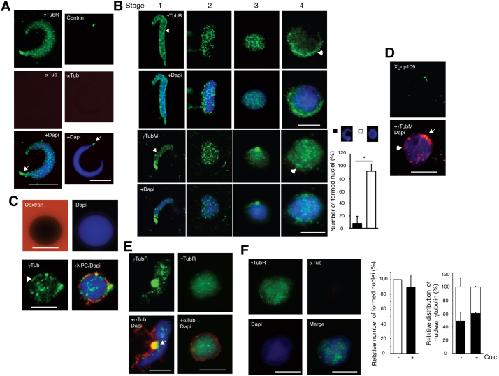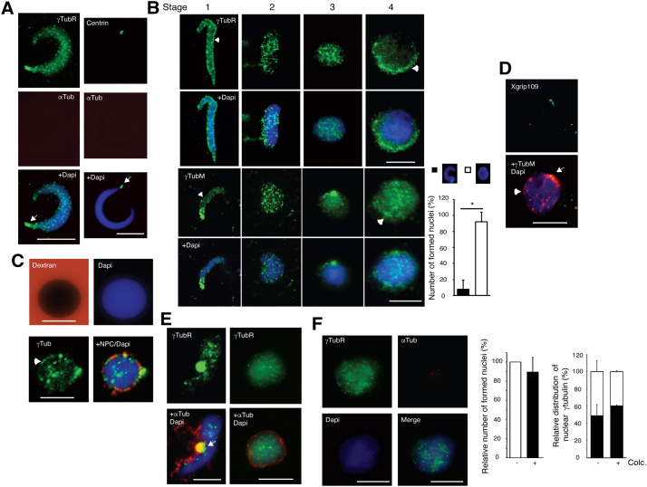 Fig. 2. γ-Tubulin and α-tubulin are differently distributed. (A) γ-Tubulin (T5192), α-tubulin and centrin were immunofluorescence stained in demembranated sperm that were isolated in the presence of colcemid and pelleted onto a cushion containing SuNaSp and glycerol before the immunostaining (n = 5). (B) To study morphological changes, demembranated sperm were incubated with egg extracts during 0 min (stage 1, condensed sperm) or 60 min before fixation (stage 2, decondensed; stage 3, small almost-formed nucleus; and stage 4, nucleus with a γ-tubulin boundary). Localization of γ-tubulin was examined by immunofluorescence staining with a rabbit and a mouse produced anti-γ-tubulin antibody, as indicated. Graph shows the mean percentage of formed nuclei (open bar; stage 3 and 4; ± s.d., n = 3; * p < 0.05). (C) To test the integrity of formed nuclei, nuclear assembly reactions were incubated with TRITC-labeled dextran. Alternatively, nuclear pore complexes (NPC) were immunofluorescence stained (n = 3). (D-F) Demembranated sperm prepared as in Fig. 1B (D, E) or as in A (F) were incubated in the presence of egg extracts for 60 min before fixation in the absence (D, E) or presence (F) of colcemid. The localization of Xgrip109, microtubules (αTub), centrosomes (γTub and αTub) and γ-tubulin were examined by immunofluorescence staining (n = 3). (F) From left to right, first graph shows the mean percentage of formed nuclei in the presence of colcemid (black bar) relative to a non-treated control egg extracts and sperm (open bar). Second graph displays mean percentage of formed nuclei with γ-tubulin localized throughout the nuclei (black bar) or marginalized to the nuclear envelope (open bar) (± s.d., n = 3). In (A-C, E, F) γ-tubulin and centrin are shown as green, α-tubulin and NPC as red and nuclei as blue (DAPI). In (D) Xgrip109 and γTub are shown as green and red, respectively. Arrows and arrowheads indicate the location of centrosomes and the γ-tubulin nuclear boundary, respectively. Scale bars, 10 μm. |