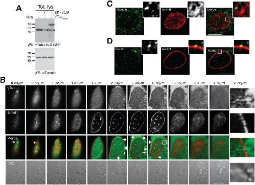Fig. 13. γ-Tubulin forms a boundary on the cytosolic side of the nucleus and its disruption affects the integrity of the lamina. (A-D) Confocal images of isolated nuclei purified in the absence (A) or presence (B-D) of cytochalasin B and colcemid from U2OS (γTub) and stable γTUBULIN shRNA-GFP-γ-tubulinresist (GFPγTub) and γTUBULIN shRNA expressing cells. (A-C) White borders show the magnified areas displayed in the insets: the γ-string meshwork on the nuclear envelope (A-C), the γ-string boundary (A, B), chromatin-associated γ-strings (B) or γ-string bridges (C). In (A-D) γ-tubulin (γTub; green, T3320), α-tubulin (αTub; red) and lamin B (laminB; red) are shown as immuofluorescence staining and nuclei were detected with DAPI (blue). (D) shows the endogenous expression of lamin B and γ-tubulin in two nuclei containing either high or low γ-tubulin expression, as indicated. (A-D) Scale bars, 10 μm. (E) U2OS and NIH3T3 cells (20 × 106 cells) were biochemically divided into cytosolic [C], nuclear membrane [N], and chromatin [CH] fractions. Each fraction was subjected to immunoprecipitations (IP) with an anti-γ-tubulin (γTub; T6557), anti-lamin B or anti-GFP (Cont.) antibody, as indicated, and developed by WB with antibodies against lamin A/C, lamin B, γ-tubulin (T5192) and α-tubulin antibody (n = 5). (A-E) The figure shows representative images from at least five experiments. See also Fig. S1. |
