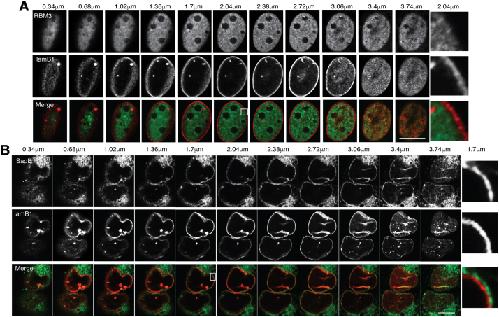 Fig. 10. Neither RBM3 nor SadBL form a cellular meshwork. (A, B) Confocal images of a Z-stack of U2OS cells transiently expressing either GFP-RBM3 (RBM3; A) or GFP-SadBL (SadB; B), and transiently expressing mCherry-tagged lamin B (laminB1). Images were collected at 0.34 μm intervals. (A) Z-stack images taken in the intervals 0.34–0.68 μm and 2.72–3.74 μm show the nuclear envelope and in the interval 1.02–2.38 μm shows the nuclear compartment of cells expressing RBM3. (B) Z-stack images taken in the intervals 0.34–0.68 μm and 3.06–3.74 μm show the nuclear envelope and in the interval 1.02–2.72 μm shows the nuclear compartment of cells expressing SADB. (A, B) The magnified area (white border) shows the mid plane of the nuclear compartment (right panels). Scale bars, 10 μm. |