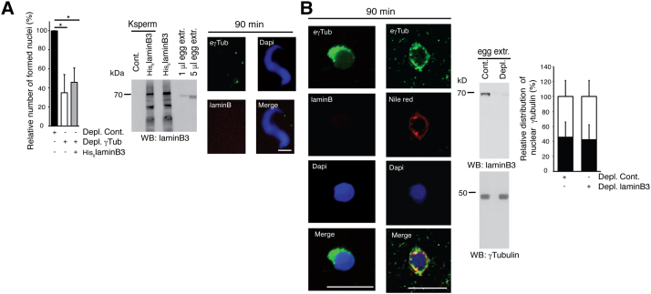 Fig. 6. γ-Tubulin promotes the formation of the nuclear envelope in the absence of lamin B3. (A) His6–lamin B3 (laminB3) was added back to Ksperm (Cont.; Ksperm without laminB3) and γ-tubulin immunodepleted egg extract (Depl.) and nuclear assembly was performed as in Fig. 5. Graph shows the mean percentage of formed nuclei in stage 3 and 4 in immunodepleted egg extracts and sperm (Depl. γTub) versus a control (black bar; Depl. Cont.), with addition of His6–lamin B3 (grey bar) to the γ-tubulin depleted extracts (± s.d., n = 3; * p < 0.05), as indicated. The western blot shows the amount of His6–lamin B3 added to sperm. To relate the amount of His6–lamin B3 to the amount present in extracts, 1 μl and 5 μl of egg extracts were loaded. Representative confocal fluorescence images of morphological changes of nuclei show the location of endogenous γ-tubulin (eγTub, green) or lamin B (red). (B) Representative confocal fluorescence images of morphological changes of nuclei in nuclear assembly reactions that were triggered by addition of lamin B3 immunodepleted egg extracts to sperm and incubated 90 min before fixation. The protein levels of lamin B3 in extracts were analyzed by WB. The graph shows the mean percentage of formed nuclei with γ-tubulin localized throughout the nuclei (black bar) or marginalized to the nuclear envelope (open bar) (± s.d., n = 3). (A, B) Localization of γ-tubulin (eγTub; green), His6–lamin B3 (lamin B; red) and lamin B3 (lamin B; red) were examined by immunofluorescence staining with the indicated antibody and nuclear membranes and nuclei were detected with Nile red (red) and DAPI (blue), respectively. The figure shows representative images from at least five experiments. Scale bars, 10 μm. |
