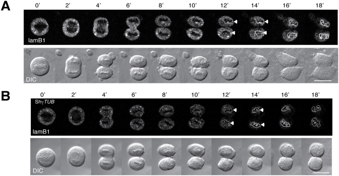 Fig. 15. Formation of the lamina in U2OS and γTUBULINsh-U2OS cells. (A, B) The DIC/fluorescence images show time-lapse series from U2OS (A) and γTUBULINsh-U2OS cells (B; shγTUB) that were transiently expressing mCherry-lamin B1 (lamB1). The image series show chosen frames of the location of lamin B1 during nuclear assembly in a mitotic cell. Images were collected every 30 sec. Scale bars, 10 μm. Arrowheads show the formed lamina around daughter chromatids. These time-lapse movies are available at movie S2 and movie S3. |