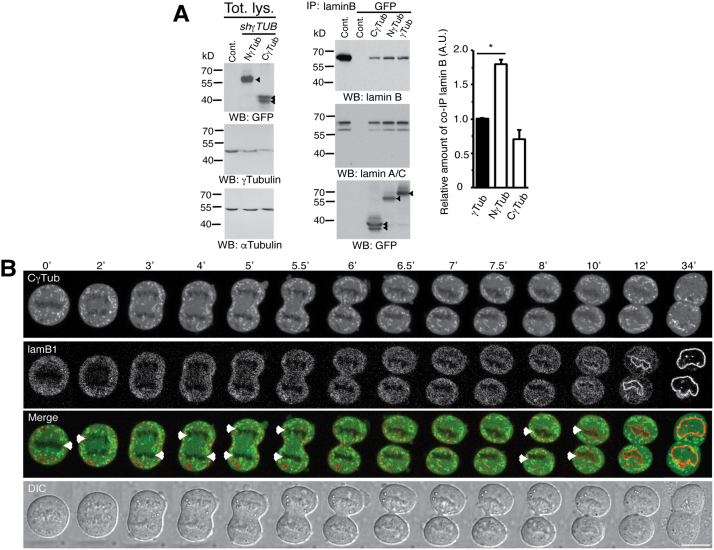Fig. 19. The C-terminal region of γ-tubulin assures the formation of chromatin-containing nuclei. (A) Total lysate from U2OS cells expressing C-γtubGFP334–452 (CγTub), N-γtubGFP1–333 (Nterm), GFP-γ-tubulin (γTub) or empty vector (Cont.) were separately immunoprecipitated with anti-GFP or anti-lamin B. The expression levels of the various recombinant proteins were first analyzed by WB with an anti-GFP and reprobed with a mixture of two anti-γ-tubulin (T3320 and T6557) antibodies. The cellulose membranes containing immunoprecipitated GFP-tagged proteins were first analyzed by WB with an anti-lamin B antibody and reprobed with an anti-lamin A/C and −GFP. Arrowheads indicate the immunoprecipitated GFP-fused proteins (n = 3). Graph shows the protein concentration of lamin B found in C-γtubGFP334–452 and N-γtubGFP1–333 immunoprecipitates relative to the lamin B concentration found in GFP-γ-tubulin immunoprecipitates expressed in arbitrary units (AU; mean ± s.d; n = 3, * p < 0.05). To adjust for differences in protein loading, the protein concentration of lamin B was determined by its ratio with the immunoprecipitated GFP-tagged protein for each sample. The protein ratio in control extracts was set to 1. (B) DIC/fluorescence images of time-lapse from a U2OS cell that is stably expressing both γTUBULIN shRNA and sh-resistant Cγ-tubGFP334–452 (CγTub, green), and transiently expressing mCherry-lamin B1 (lamB1; red) with Hoechst 33258 stained chromatin (blue), as indicated. The image series show chosen frames of the location of Cγ-tubGFP334–452 and lamin B1 during nuclear assembly in a mitotic cell. Images were collected every 30 sec. Scale bars, 10 μm. See also movie S4. |