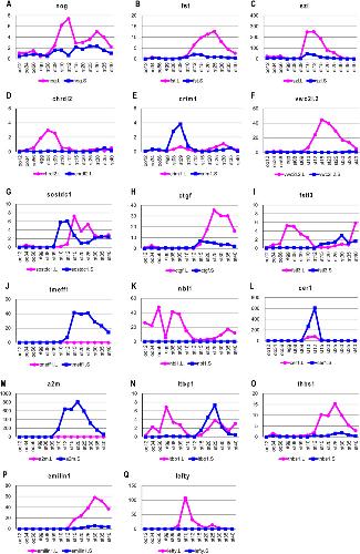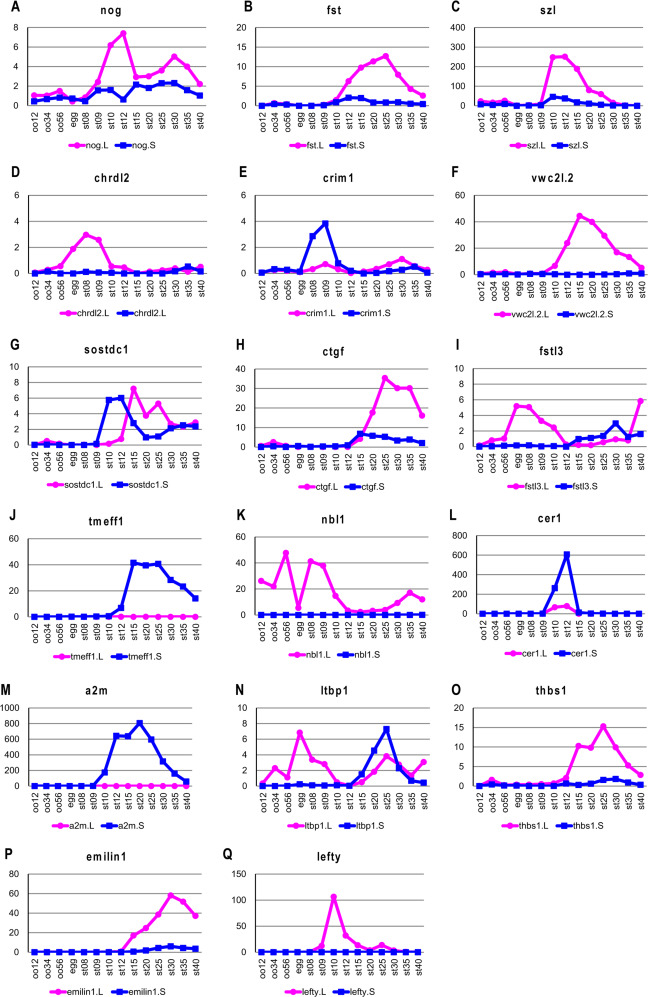 Fig. 3. Differential expression of 17 extracellular regulatory factors (AâQ). The y axis shows the TPM value from RNA-seq analysis. Gene expression of the L and S homeologs is indicated by the red and blue lines, respectively. oo12, oo34, and oo56 indicate oocyte stages 1/2, 3/4, and 5/6, respectively. The embryonic stages of Nieuwkoop and Faber (1967) are also indicated. |