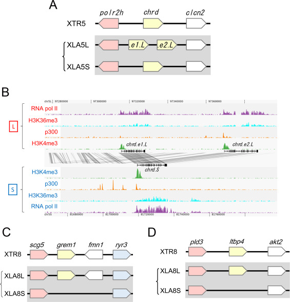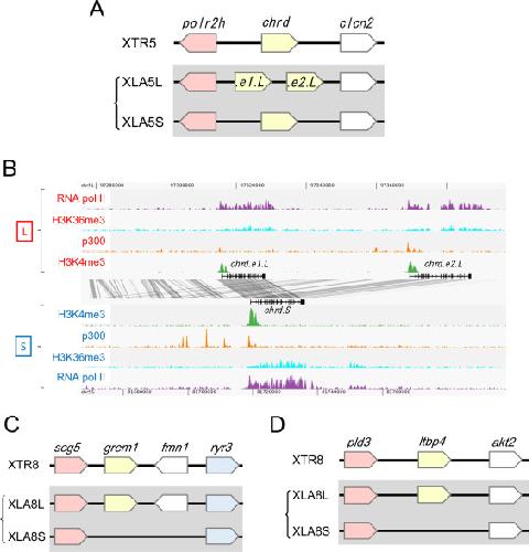 Fig. 4. Genomic structure of the chordin, gremlin1, formin1 and ltbp4 loci. (A) Genomic structure of the chordin loci. The chordin (chrd) gene is specifically amplified on the X. laevis L chromosome (chrd.e1.L and chrd.e2.L). (B) Epigenetic modifications of the X. laevis chordin loci. Shown are the genomic profiles of H3K4me3 (green), p300 (yellow), H3K36me3 (blue) and RNA Polymerase II (purple) ChIP-seq tracks. The gene annotation tracks show the chordin genes on the homeologous L (top) and S (bottom) chromosomes. The conservation between the L and S genomic sequence is shown in grey lines between the gene annotation tracks. (C) Genomic structure of the gremlin1 (grem1) and formin1 (fmn1) loci. Gremlin1 and Formin1 function to inhibit BMP signaling during limb formation. Both grem1 and fmn1 genes have been lost from the X. laevis S chromosome. (D) Genomic structure of the ltbp4 loci. The ltbp4 gene has been lost from the X. laevis S chromosome. |