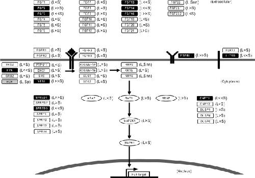 Fig. 6. Overview of genomic structure and gene expression in the FGF pathway. L and S indicate homeologs on the L and S chromosomes, respectively. The suffixes e, p, and d following L or S indicate “expansion”, “pseudogene”, and “deletion”, respectively. In cases where the genomic sequence was not available due to the absence of a scaffold or a large N gap, the L and S homeologs are indicated by the suffixes “ns (no scaffold)” or “nn (no model due to N)”. Inequality signs indicate the relative expression between a homeologous pair of genes. Differentially expressed genes and singletons are shown as black and grey boxes, respectively. |