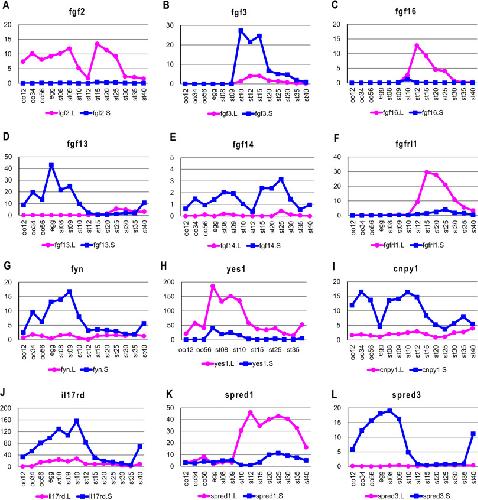 Fig. 7. Differential expression of twelve FGF ligands, receptors, and components of the RasâMAPK pathway (A-L). The y axis shows the TPM value from RNA-seq analysis. Gene expression of the L and S homeologs is indicated by the red and blue lines, respectively. oo12, oo34, and oo56 indicate oocyte stages 1/2, 3/4, and 5/6, respectively. The embryonic stages of Nieuwkoop and Faber (1967) are also indicated. |