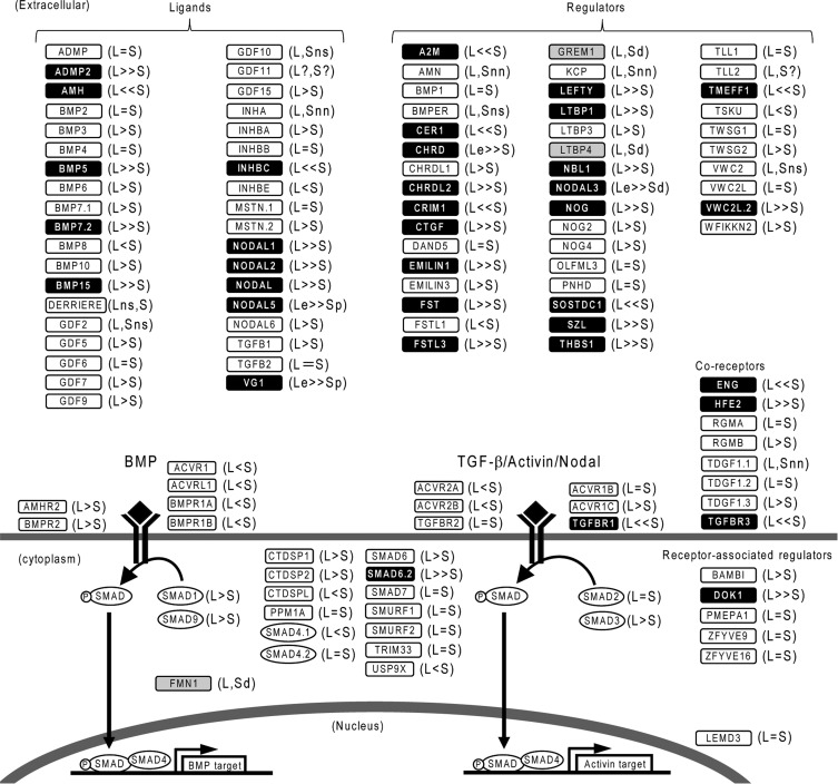 Fig. 1. Overview of genomic structure and gene expression in the TGF-β pathway. L and S indicate homeologs on the L and S chromosomes, respectively. The suffixes e, p, and d following L or S indicate âexpansionâ, âpseudogeneâ, and âdeletionâ, respectively. In cases where the genomic sequence was not available due to the absence of a scaffold or a large N gap, the L and S homeologs are indicated by the suffixes âns (no scaffold)â or ânn (no model due to N)â. The expression of gdf11 and tll2 homeologs was not compared owing to the uncertainty of gene identity. Inequality signs indicate the relative expression between a homeologous pair of genes. Differentially expressed genes and singletons are shown as black and grey boxes, respectively. |
