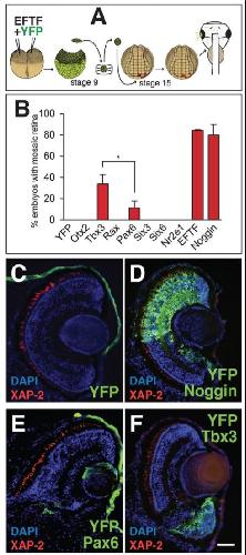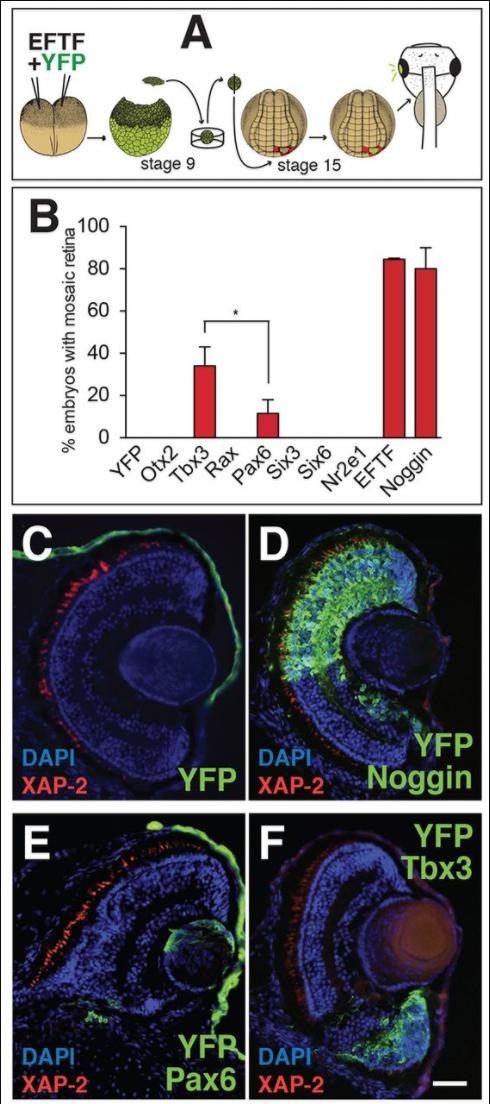 Fig. 1. Tbx3 is sufficient to specify pluripotent cells to a retinal lineage. (A) Schematic illustrating the animal cap transplant (ACT) to eye field assay (ACTâEF; Viczian and Zuber, 2010). (B) Histogram showing the percentage of tadpoles in which transplanted cells formed retina in response to the expression of YFP only, YFP with the indicated EFTF, an EFTF cocktail or Noggin (YFP only, 500â pg; Otx2, 25â pg; Tbx3, 50â pg; Rax, 50â pg; Pax6, 100â pg; Six3, 25â pg; Six6, 25â pg; Nr2e1, 25â pg; EFTF cocktail; Noggin, 2.5â pg). (C-F) Sections of tadpoles receiving transplants expressing (C) YFP and (D) Noggin, (E) Pax6 or (F) Tbx3. XAP-2 (red), DAPI (blue) and YFP (green) detect rod photoreceptors, nuclei and transplanted cells, respectively. Dorsal is up. N=2; nâ¥40; *Pâ¤0.05. Scale bar: 50â μm. |