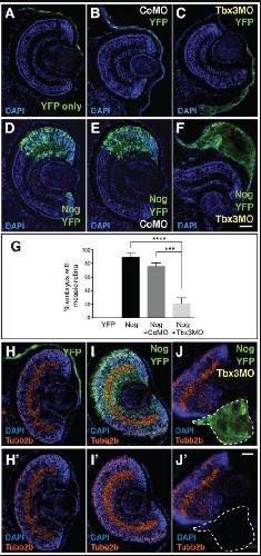 Fig. 3. Tbx3 knockdown inhibits the retinal- and neural-inducing activity of Noggin. (A-F) Retinal sections of tadpoles that received grafts at stage 15 (ACTâEF). (A-C) Donor cells expressed (A) YFP only, or were co-injected with (B) CoMO or (C) Tbx3MO-LS (Tbx3MO). (D-F) Donor cells expressed (D) YFP plus Noggin (Nog) alone, or in combination with (E) CoMO or (F) Tbx3MO. (G) Histogram showing the average percentage of tadpoles in which donor cells formed retina. (H-Jâ²) Retinas of tadpoles receiving donor cells expressing (H,Hâ²) YFP alone, or in combination with (I,Iâ²) Noggin or (J,Jâ²) Noggin with Tbx3MO. Staining marks nuclei (DAPI; blue), donor-derived cells (YFP; green) and neural tissue (Tubb2b; red). Dashed line in J and Jâ² indicates location of donor cells. Dorsal side up. N=3; nâ¥40; ***P<0.001, ****P<0.0001. Scale bar: 50â μm. |