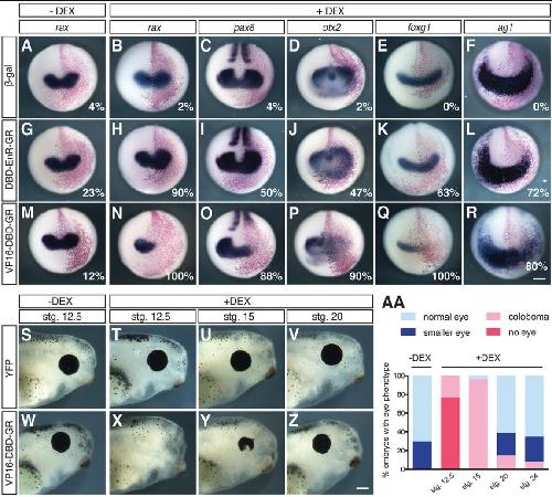 Fig. 7. Tbx3 repressor activity is required at eye field stages for normal neural patterning and eye formation. (A-R) In situ hybridization was used to detect changes in rax, pax6, otx2, foxg1 and ag1 transcript levels at stage 15. Eight-cell embryos were injected in one blastomere with β-gal alone (150â pg, A-F), and in combination with DBD-EnR-GR (12.5âpg, G-K; 50â pg, L) or VP16-DBD-GR (5â pg, M-R) RNA. At stage 12.5, embryos were untreated (A,G,M) or treated with dexamethasone (B-F, H-L and N-R). The percentage showing a change in expression is indicated, N=2; nâ¥41. (S-Z) The repressor activity of Tbx3 is required at eye field stages for normal eye formation. Control (S-V)- and VP16-DBD-GR (W-Z)-injected embryos were untreated (S,W) or treated with dexamethasone starting at the indicated stage. (AA) Histogram shows the percentage of tadpoles with the indicated eye defects, N=2; nâ¥35. Scale bars: 300â μm (R), 400â μm (Z). |