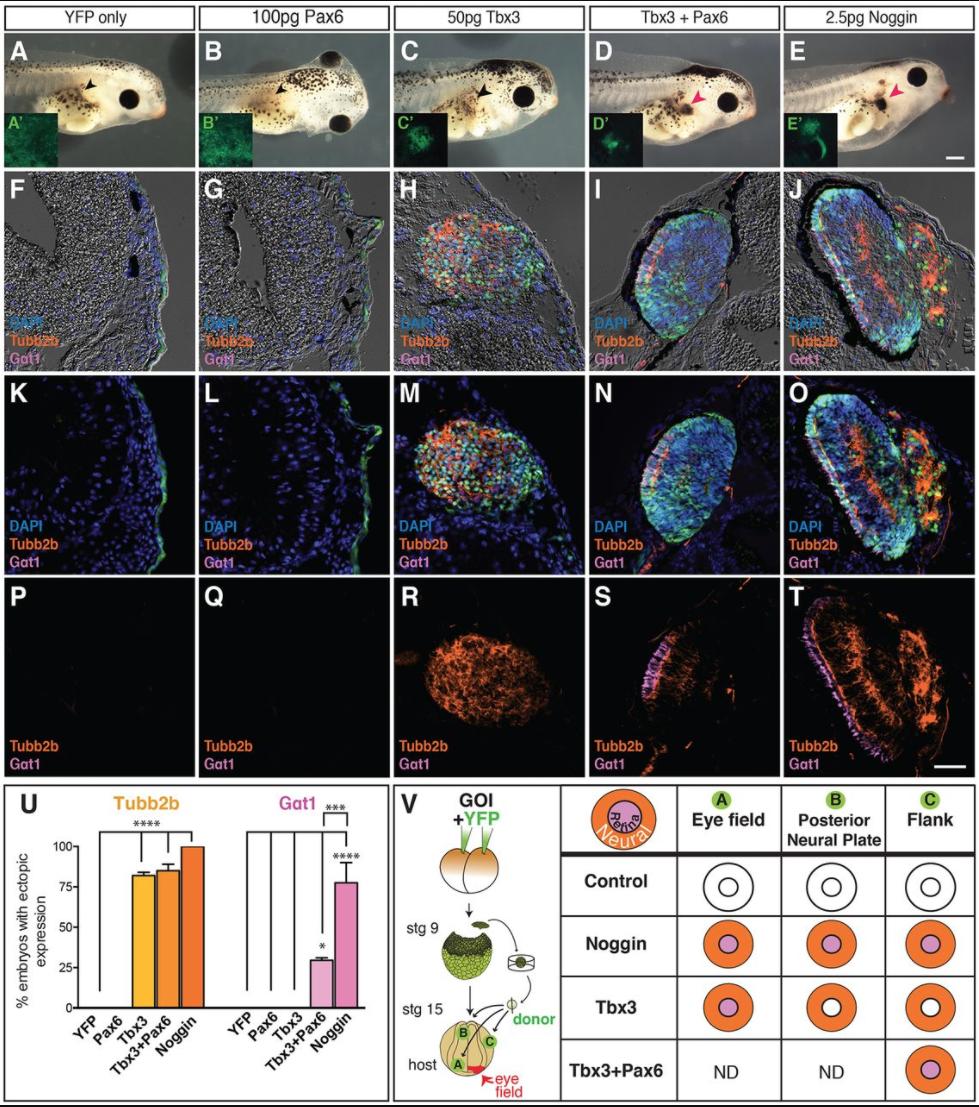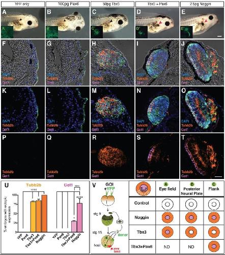 Fig. 9. Together, Tbx3 and Pax6 are sufficient to determine retina from pluripotent cells. (A-T) Pluripotent cells isolated from embryos injected with the indicated RNAs were transplanted to the flank of stage 15 embryos then grown to tadpoles (ACTâFlank). Arrowheads (A-E) show location of transplant (green fluorescence, Aâ²-Eâ²). (F-T) Sections were stained for a neural marker (Tubb2b, orange), rod photoreceptor marker transducin (Gαt1, magenta) and nuclei (DAPI, blue). (U) Percentage of transplants with YFP+/Tubb2b+ and YFP+/Gαt1+ cells, N=2; nâ¥29; *Pâ¤0.05, ***P<0.001, ****Pâ¤0.0001. (V) Schematic graphically summarizing results obtained from transplants performed in Figs 1,3-5 and 9; GOI, gene of interest. Scale bars: 400â μm (E), 50â μm (T). |