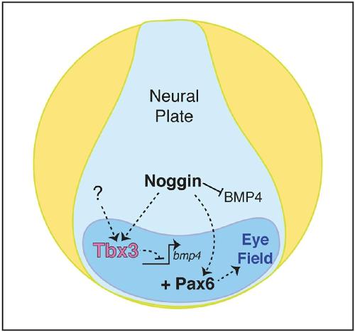 Fig. 10. Model illustrating the role of Tbx3 during eye field determination. Noggin protein binds BMP4 directly blocking BMP receptor activation in the early neural plate (light blue), which includes the presumptive eye field (dark blue). Tbx3 is required to repress bmp4 transcript levels, resulting in continued BMP inhibition in the eye field. The combined activity of Tbx3 and Pax6 is sufficient to determine the eye field to form retina. Solid and dashed lines indicate direct and possible indirect interactions, respectively. |