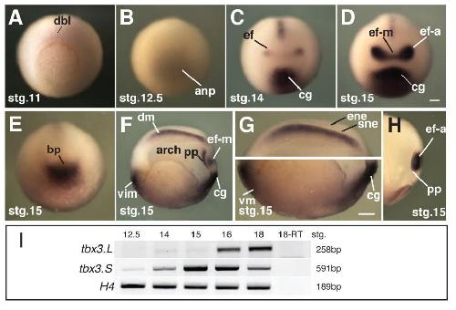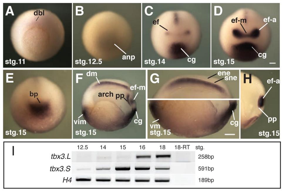 Fig. S1. Tbx3 is expressed in a pattern consistent with a role in eye formation. Posterior (A,E) and anterior (B-D) views of intact embryos showing the expression pattern of tbx3 at the indicated developmental stages. (F-H) Stage 15 embryos stained by whole mount in situ hybridization, then cut midsagittal (F,G) and parasagittal (H) to reveal internal tissues expressing tbx3. (I) RT-PCR of isolated eye fields at the indicated stages detecting the expression of transcripts for tbx3.L and tbx3.S homeologs. Abbreviations: dbl, dorsal blastopore lip; anp, anterior neural plate; ef, eye field; cg, cement gland; ef-m, eye field - midline; ef-a, eye field - eye anlagen; bp, blastopore; vim, ventral involuting mesoderm; dm, dorsal mesoderm; arch, archenteron; pp, prechordal plate; sne, sensorial layer of neuroectoderm; ene, epithelial layer of neuroectoderm; vm, ventral mesoderm; 18-RT, stage 18 minus reverse transcriptase control. Scale bar, 200 μm. |