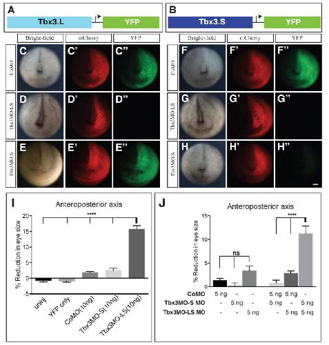 Fig. S2. Tbx3 is required for normal eye formation. (A-B) Schematic of constructs used to test morpholino activity in the whole embryo. (C-Hâ²â²) Bright-field (C-H), mCherry fluorescence (C'-H') and YFP fluorescence (Câ²â²-Hâ²â²) Development ⢠Supplementary information Development 143: doi:10.1242/dev.130955: Supplementary information images of neurula stage embryos unilaterally injected at the two-cell stage (right side - readerâs perspective) with cRNA for mCherry and Tbx3-L-YFP (C-Eâ²â²) or Tbx3-S-YFP (FHâ²â²) as diagrammed above the panels. CoMO (C-Câ²â², n=54; F-Fâ²â², n=57), Tbx3MO-LS (DDâ²â², n=60; G-Gâ²â², n=59) and Tbx3MO-S (E-Eâ²â², n=58; H-Hâ²â², n=60) were also injected to determine if translation of the YFP fusion constructs were blocked by each morpholino. Scale bar, 200 μm. (I-J) The percent reduction in eye size was determined by comparing the anteroposterior diameter of the eye on the uninjected side to the injected side. Histograms show eye size differential measured in wild-type animals and tadpoles injected as embryos with YFP and the indicated morpholino or combination of morpholinos. Histograms show mean±s.e.m; N=3; ns, P>0.05; ****Pâ¤0.0001. |
