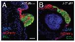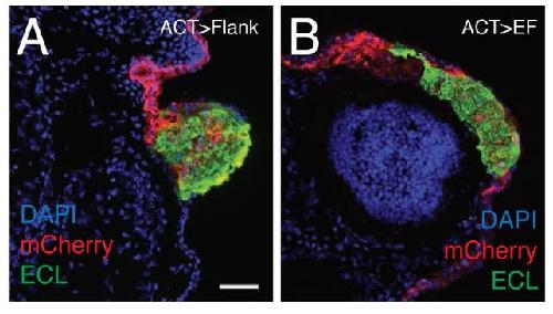 Fig. S5. Tbx3 knockdown generates cement gland in Noggin expressing donor cells. (A-B) Transverse sections of stage 43 embryos with flank (A) and eye field (B) transplants of donor cells expressing mCherry, Noggin and Tbx3MO. Sections were imaged to detect cell nuclei (DAPI; blue), mCherry fluorescence (red) and green fluorescently labeled cement gland marker ECL (5 μg/ml; Fluorescein Erythrina crista-galli Lectin, cat#FL-1141, Vector Laboratories, Inc., Burlingame, CA). Eye in (B) is oriented with dorsal side to the top; N=2, nâ¥25. Scale bar, 50 μm. |