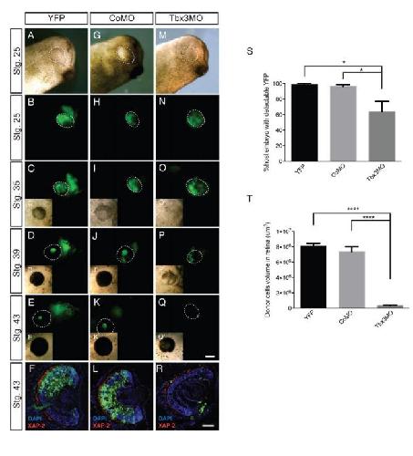 Fig. S8. Tbx3 knockdown results in progressive loss of donor eye field cells and their progeny during eye development. (A-R) Donor embryos were injected into 1 dorsal blastomere at the 8-cell stage, then cultured to stage 15, when a portion of the donor eye fields from YFP-only (A-F, 500 pg, n=59,), YFP plus CoMO (G-L, 10 ng, n=54), or YFP plus Tbx3MO (M-R, 10 ng, n=58) injected embryos were grafted into host, stage 15 eye fields (EFâEF). The fate of YFPDevelopment ⢠Supplementary information Development 143: doi:10.1242/dev.130955: Supplementary information positive donor cells was followed using brightfield (A, G, M, insets Câ-Eâ, Iâ-Kâ, and Oâ-Qâ) and YFP fluorescence (B-E, H-K, and N-Q) at stages 25, 35, 39 and 43. (F, L, and R) Sections of stage 43 retinas were stained for YFP-positive donor cells (green), the rod marker XAP-2 (red) and nuclei (blue). (S) The percent of live tadpoles with detectable YFP expression. (T) The volume of YFP-positive cells in retinas that received donor eye field transplants from YFP-only, YFP plus CoMO or YFP plus Tbx3MO transplants (YFP n=20, CoMO n=19, Tbx3MO n=20). Dotted lines indicate the boundary of the optic vesicle or cup. Histograms show mean±s.e.m; *Pâ¤0.05, and ****Pâ¤0.0001; scale bar, 50 μm F,L,R, and 200 μm all others. |