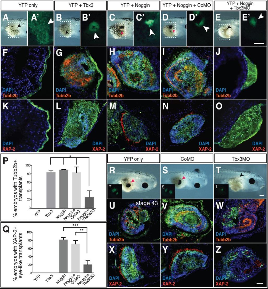 Fig. 4. Tbx3 induces neural but not retinal tissue and is required for Noggin to determine pluripotent cells to a neural and retinal fate. (A-O) Donor cells expressing the indicated RNAs and morpholinos were grafted to the flank of stage 15 host embryos (ACTâFlank). Arrowheads (A-Eâ²) indicate location of grafted cells in brightfield (A-E) and YFP fluorescence (Aâ²-Eâ²) images. Dashed boxes in A-E outline magnified regions in Aâ²-Eâ². Sections are stained for YFP (F-O, green), the neural marker Tubb2b (F-J, orange) and rod photoreceptor marker, XAP-2 (K-O, red). (P,Q) Histograms showing percentage of donor transplants that were YFP+/Tubb2b+ or YFP+/XAP-2+. (R-Z) Donor eye fields expressing YFP only, with CoMO or Tbx3MO were transplanted to the flank of stage 15 host embryos (EFâFlank). Râ²-Tâ² show the location of YFP fluorescence in the flank of embryos in R-T. DAPI-labeled tadpole sections were stained for YFP (green) and Tubb2b (U-W, orange) or XAP-2 (X-Z, red). N=2; nâ¥39; *Pâ¤0.05, **P<0.01, ***P<0.001. Scale bars: 400â μm (Eâ²,T), 50â μm (Z). |