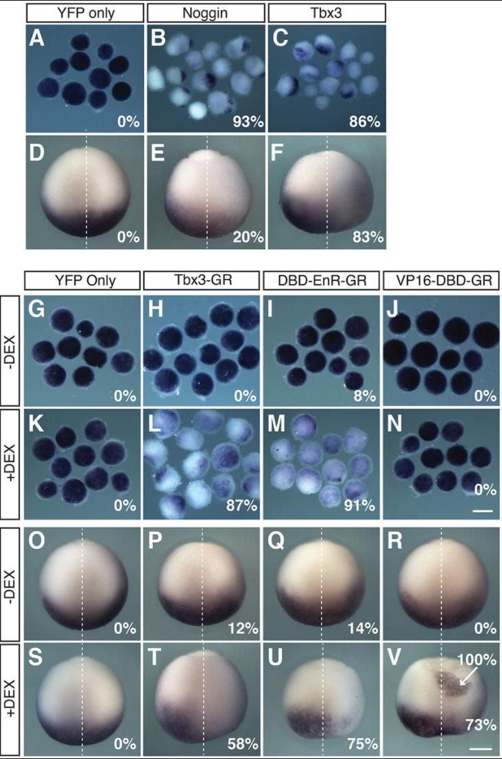 Fig. 6. Noggin and Tbx3 repress bmp4 expression in vitro and in vivo. bmp4 expression was detected by in situ hybridization in ectodermal explants and intact embryos. (A-C,G-N) Ectodermal explants were isolated at stage 9 from embryos injected bilaterally at the 2-cell stage with the indicated RNA. Explants were left untreated (A-C,G-J) until stage 22, or treated from stage 15 with dexamethasone (K-N). The percentage of explants with reduced bmp4 expression is indicated, N=4; nâ¥36. (D-F,O-V) 4-cell stage embryos were injected in one dorsal blastomere with the indicated RNA. Embryos were left untreated (D-F,O-R) until stage 12.5, or treated from stage 9 with dexamethasone (S-V). The percentage with reduced bmp4 expression is indicated, N=3; nâ¥48. (V) 100% of embryos showed posterior ectopic bmp4 expression (arrow), while 73% showed reduced bmp4 expression anteriorly. RNA injected: 500â pg YFP, 2.5â pg Noggin, 50â pg Tbx3, 100â pg Tbx3-GR, 250â pg DBD-EnR-GR, 5â pg VP16-DBD-GR (doubled for explants). Dorsal view, anterior toward the bottom. Scale bars: 200â μm (N), 400â μm (V). |