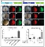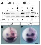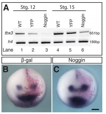 Fig. S9. Noggin represses tbx3 expression in vitro, while inducing in vivo tbx3 expression. (A) RT-PCR was used to detect changes in tbx3 expression in vitro at the equivalent of stages 12 and 15 in ectodermal explants isolated at stage 9 from YFP-only and YFP plus Noggin injected embryos. RT-PCR for histone h4 transcript was used to confirm approximately equal amounts of RNA was used in the reverse transcription reactions. (B-C) Whole mount in situ hybridization was used to detect changes in tbx3 expression (violet) at stage 15 in response to injection of Ãgal-only (B; red) and Ãgal plus Noggin (C). N=3; nâ¥58. Scale bar, 300 μm. |