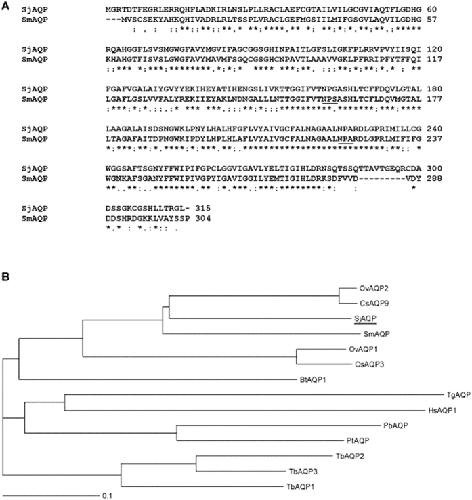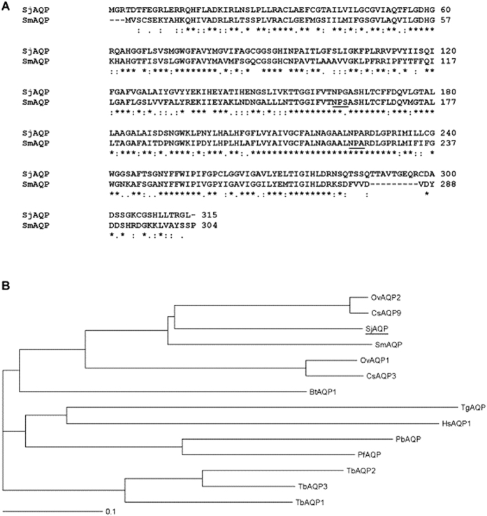 Figure 1. Deduced primary protein sequence and phylogenetic analysis of SjAQP.(A) Deduced amino acid sequence of SjAQP and alignment with its homolog SmAQP from Schistosoma mansoni. Asterisks indicate fully conserved residues; colons indicate strongly conserved similar residues with scores >0.5 in the Gonnet PAM 250 matrix; and periods indicate weakly similar residues with scores ≤0.5 in the matrix. The two highly conserved loops of the AQP family are underlined. (B) Phylogenetic analysis of SjAQP and characterized homologs from Homo sapiens (HsAQP1), Bos taurus (BtAQP1), Plasmodium berghei (PbAQP), Plasmodium falciparum (PfAQP), Opisthorchis viverrini (OvAQP), Clonorchis sinensis (CsAQP), Toxoplasma gondii (TgAQP), and Trypanosome brucei (TbAQP). Unit, 0.1 amino acid substitutions per site.