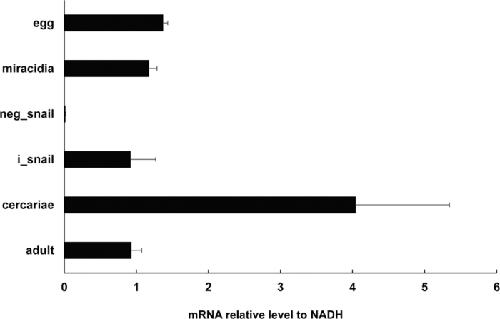 Figure 4. Expression profiles of SjAQP in different stages of the parasite life cycle.Reverse transcription-quantitative polymerase chain reaction revealed the expression of SjAQP in S. japonicum developmental-specific stages – eggs, miracidia, cercariae, and adults. cDNA levels were normalized using the NADH housekeeping gene as an internal control. neg_snail, naive snails as the negative control; i_snail, S. japonicum infected snails.
