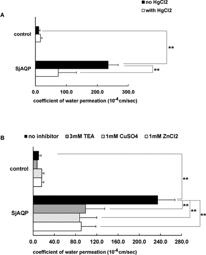 Figure 2. Water-permeating activity of SjAQP.(A) SjAQP-expressing oocytes significantly facilitate water movement across cell membranes, and the permeation is significantly inhibited by 1.0 mM HgCl2. Black and white bars represent permeation coefficients of control or SjAQP-expressing oocytes, respectively. (B) Water permeation by SjAQP-expressing oocytes is significantly inhibited by 3.0 mM tetraethylammonium, 1.0 mM CuSO4, and 1.0 mM ZnCl2. The x-axis is the coefficient of osmotic water permeability, Pf, with the unit 10−4 cm/s. Data are represented as means ± SDs. *p ≤ 0.05, **p ≤ 0.01 by a Student’s t-test.