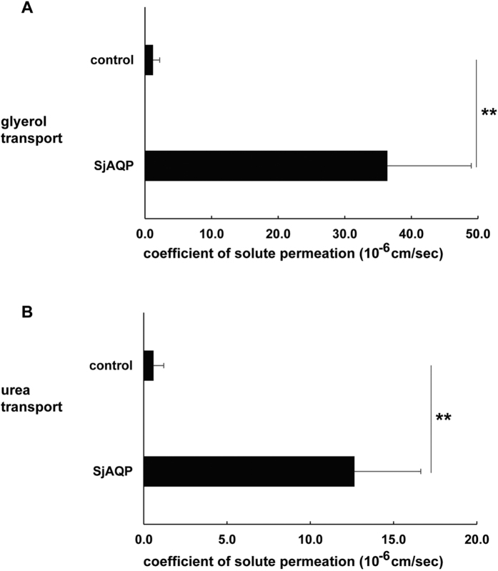 Figure 3. Solute-permeating activities of SjAQP.(A) SjAQP-expressing oocytes significantly facilitate glycerol movement across oocyte membranes compared with control oocytes (B) SjAQP-expressing oocytes significantly facilitate urea movement across cell membranes compared with control oocytes. The x-axis is the coefficient of solute permeability, Ps, with the unit 10−6 cm/s. Data are represented as means ± SDs. **p ≤ 0.01 by a Student’s t-test.