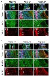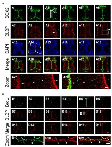 Figure 1. BLBP+ radial glia are SOX2+ cells in the Xenopus tectum. (A) Optic tectum were co-labeled with anti-SOX2 and anti-BLBP antibodies at stage 48. Six representative sections of the whole tectum were shown (A1âA6: SOX2; A7-A12: BLBP; A13âA18: DAPI and A19âA24: SOX2 and BLBP merged). Arrow heads indicate the endfeet of Radial glial cells (RGs; A12, A25, and A26); Arrows indicate cells stained for DAPI and SOX2; Stars indicate the processes of radial glia; White circle indicates the cluster of SOX2+ cells (A3); White square indicates the area for counting the number of BrdU+ cells (A3). Stars indicate the elongated processes of RGs (A25-A26). Scale: 100 μm (zoom in: 20 μm). (B) Tadpoles were incubated with BrdU for 2 h and co-labeled with anti-BrdU and anti-BLBP antibodies at stage 47. Six representative sections were shown (B1âB6: BrdU staining; B7âB12: BLBP staining and B13âB18: BrdU and BLBP merged). White square (B5) indicates the area for the zoom in images (B19âB21). Scale: 100 μm (zoom in: 20 μm). |