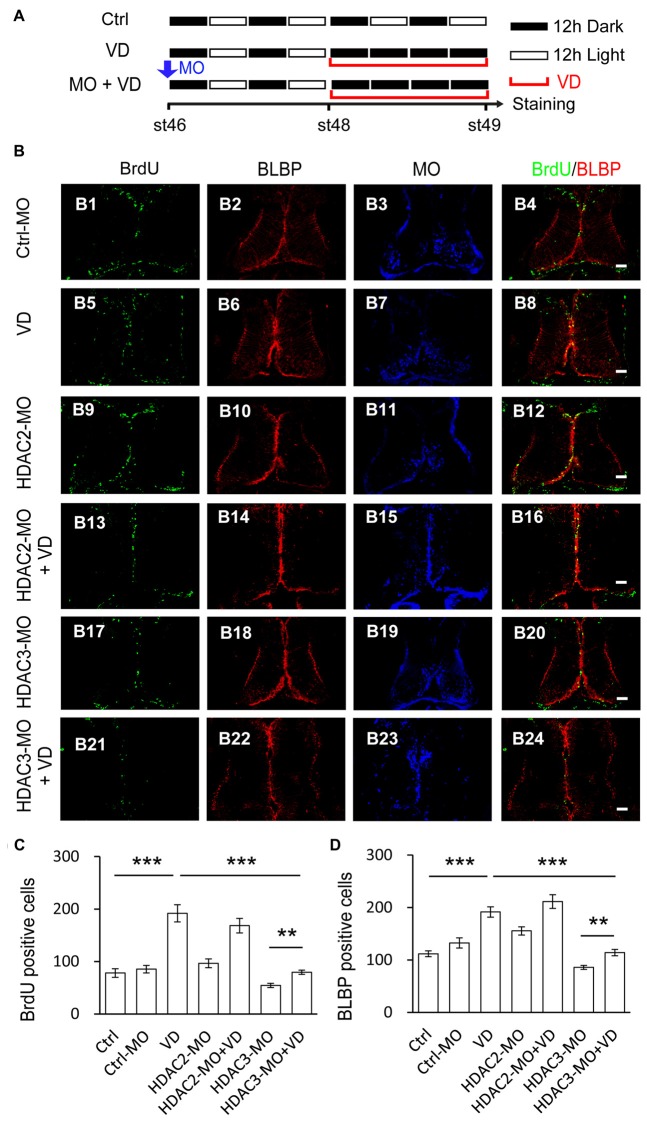 Figure 7. Visual deprivation-induced increase of proliferative cells is prevented by HDAC3 knockdown but not HDAC2 knockdown. (A) A cartoon showing that tadpoles at stage 46 were placed in a 12 h/12 h dark/light incubator for control, or a dark box for VD, or electroporated with HDAC2-MO/HDAC3-MO and placed in a dark box after 48 h for HDAC2-MO+VD/HDAC3-MO+VD. Tectal brains were labeled with BrdU at stage 49. (B) Representative fluorescent images showing BrdU- and BLBP-labeled cells in ctrl-MO (B1âB4), VD (B5âB8), HDAC2-MO (B9âB12), HDAC2-MO+VD (B13âB16), HDAC3-MO (B17âB20) and HDAC3-MO+VD (B21âB24) tadpoles. Scale: 50 μm. (CâD) Summary data showed that VD increased BrdU- and BLBP-labeled cells. HDAC3 but not HDAC2 knockdown partially blocked VD-induced increase of proliferative cells. (BrdU: Ctrl, 78.0 ± 8.3, N = 5, Ctrl-MO, 85.4 ± 7.1, N = 5, VD, 191.8 ± 16.4, N = 4, HDAC2-MO, 96.5 ± 8.5, N = 6, HDAC2-MO+VD, 168.2 ± 13.9, N = 4, HDAC3-MO, 54.2 ± 4.0, N = 4, HDAC3-MO+VD, 79.4 ± 4.1, N = 5; BLBP: Ctrl, 112.0 ± 5.6, N = 5, Ctrl-MO, 132.6 ± 9.7, N = 5, VD, 191.7 ± 9.9, N = 4, HDAC2-MO, 155.5 ± 7.8, N = 4, HDAC2-MO+VD, 211.5 ± 13.0, N = 5, HDAC3-MO, 86.0 ± 3.9, N = 4, HDAC3-MO+VD, 114.2 ± 6.0, N = 5; ***p < 0.001, **p < 0.01). |